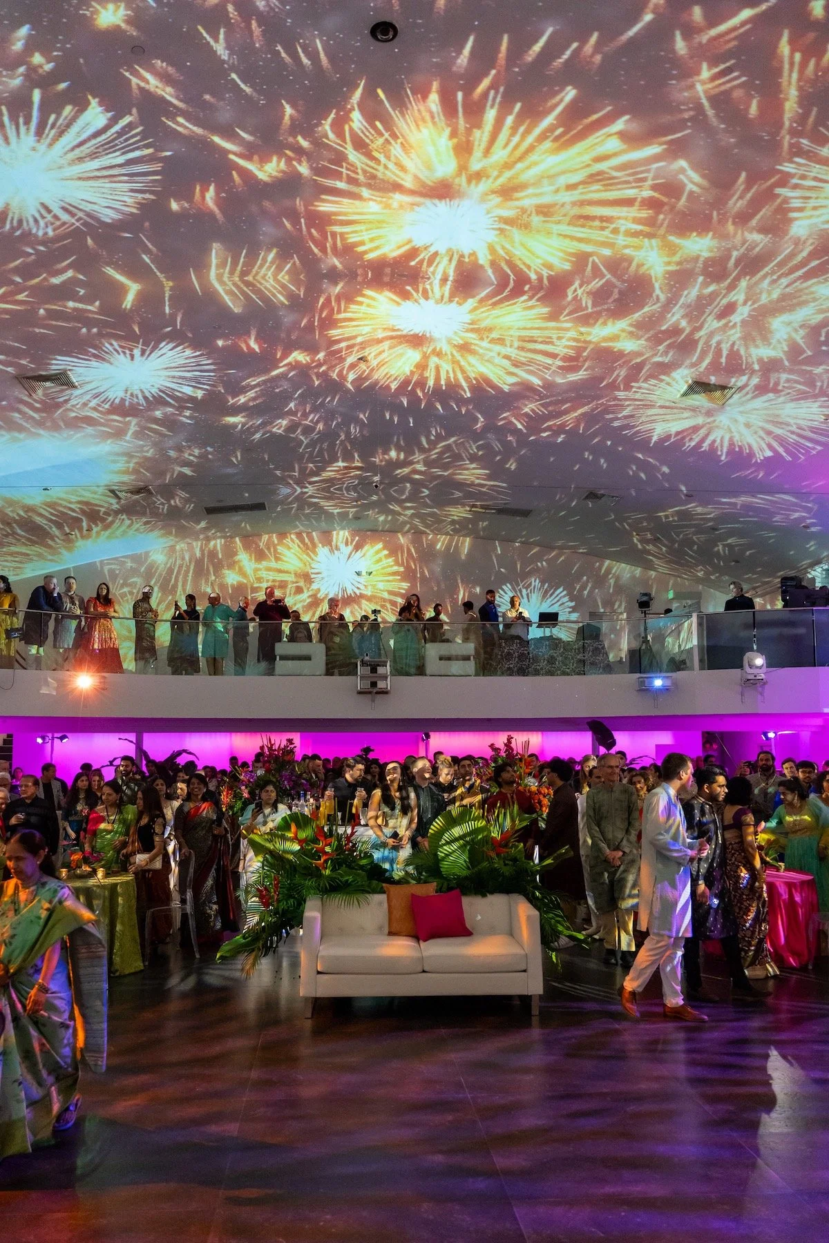The Temple House is already a top Miami Beach venue, and for this celebration it transformed into a living canvas. Projection-mapped visuals washed the walls in saturated pinks, oranges, and fresh greens, a nod to Miami’s tropical palette and the couple’s love of bold color. From the first welcome to the last dance, the energy never dipped: choreographed performances, heartfelt toasts, and a packed dance floor kept the program flowing.