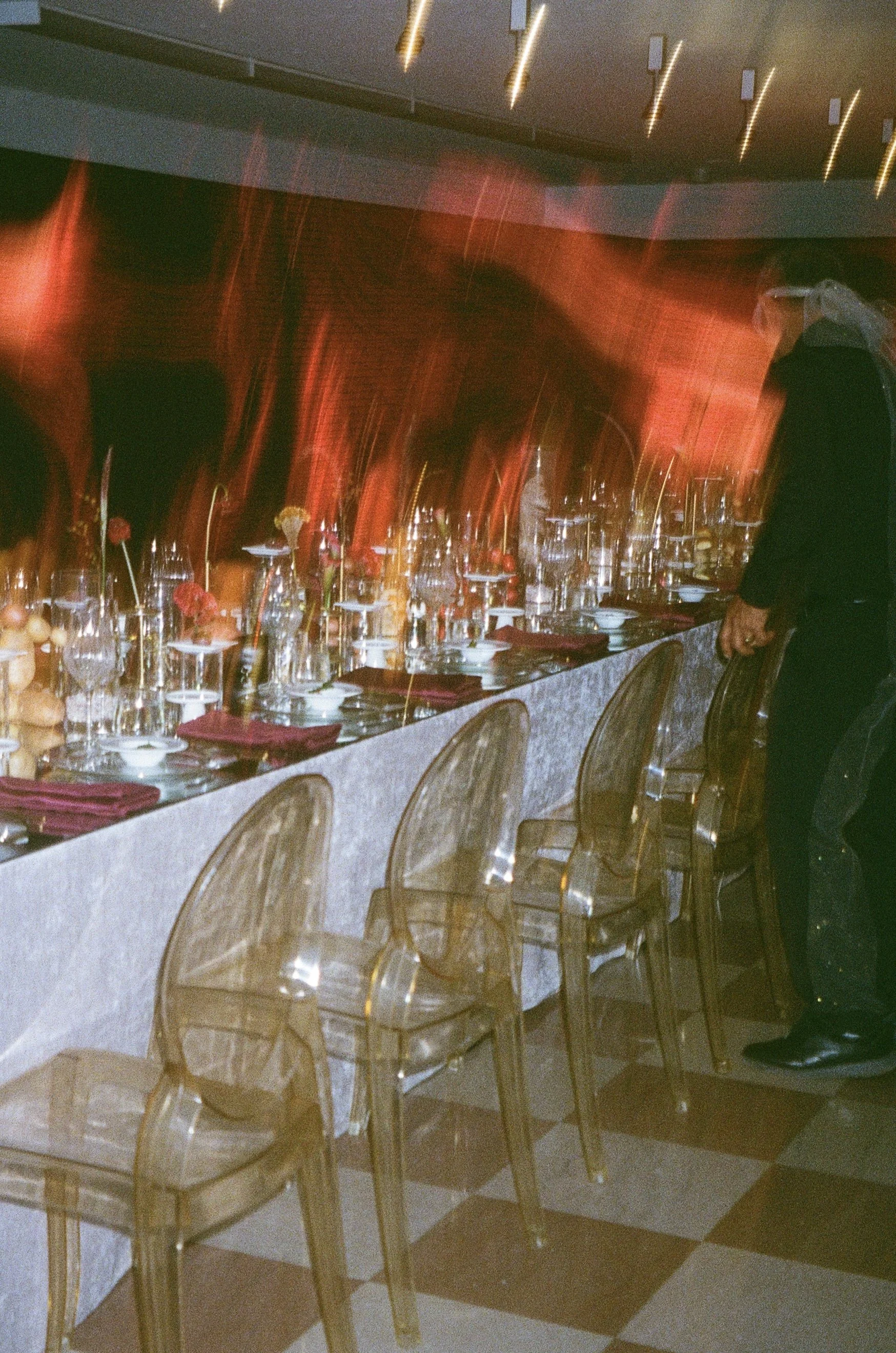 Guests were escorted into the building’s original bank vault for a private, 50-person experiential dinner. The setting was deliberately intimate and a touch subversive, history and modernity sharing the same table. Transparent chargers, deep merlot linens, and mirrored surfaces amplified a golden lightscape, while glass cloches dotted the table like mini vitrines.