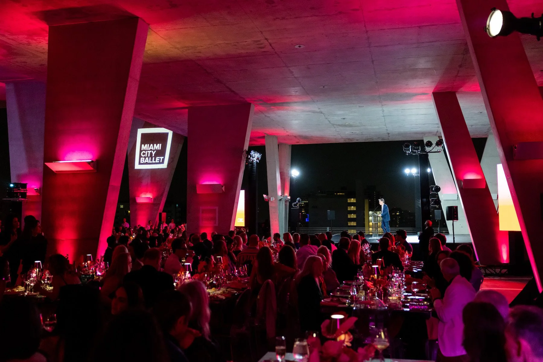For the Miami City Ballet gala, that raw architectural setting became part of the design story. Rather than compete with the venue, the event design leaned into its strong modernist character. Vibrant lighting, expressive florals, and high-contrast visual moments activated the space while preserving its openness and sense of scale.