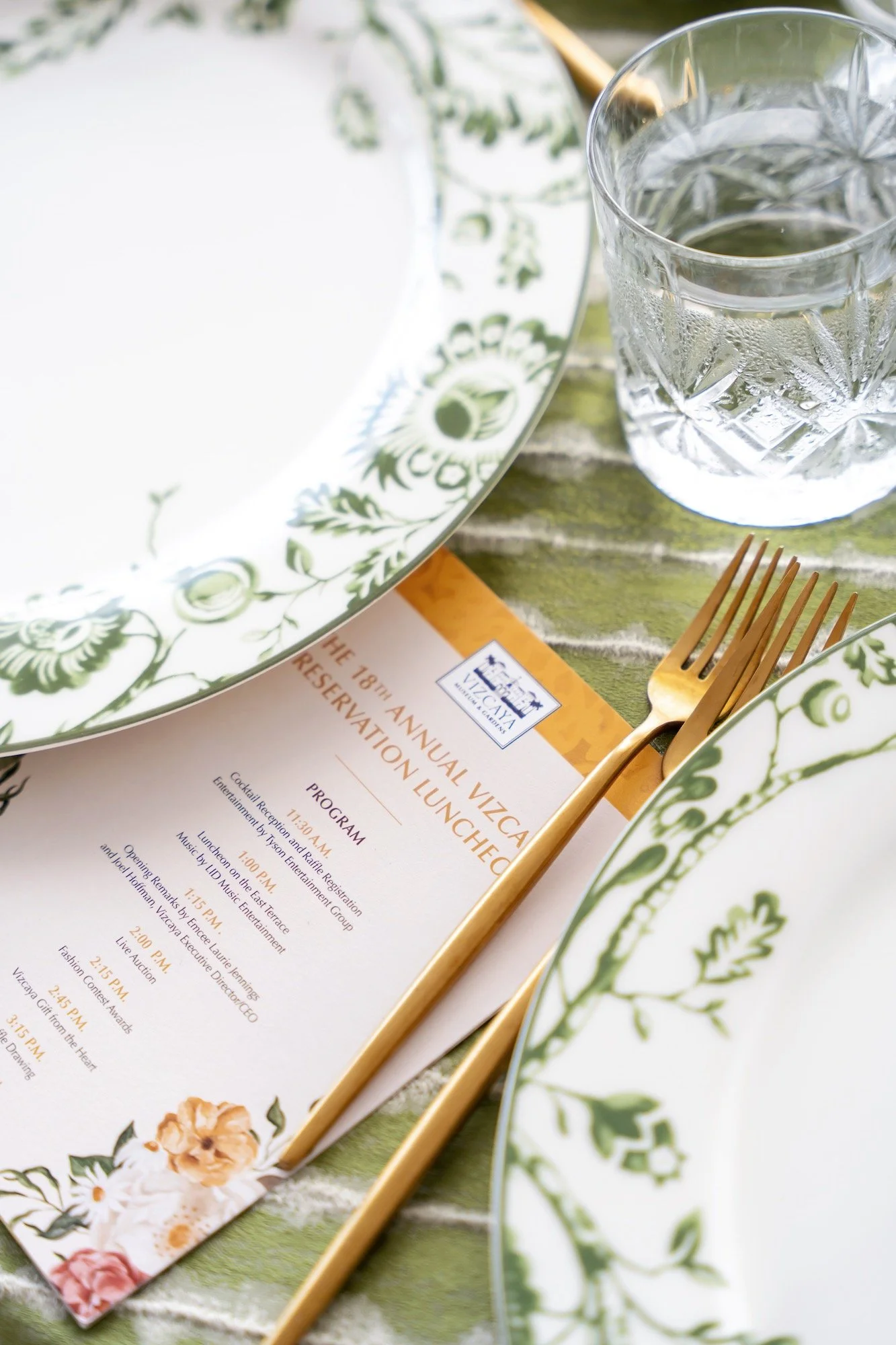 The luncheon menu drew inspiration from the brightness of the season and the garden setting of Vizcaya itself. A first course of hearts of palm and avocado with ruby grapefruit and pink peppercorn vinaigrette set a fresh, colorful tone, followed by a delicate pan-roasted seabass served with vibrant seasonal accompaniments. The meal concluded with a light and refined mango cream millefeuille, an airy dessert that echoed the tropical elegance of this luxury Miami event venue and the festive atmosphere of the day.