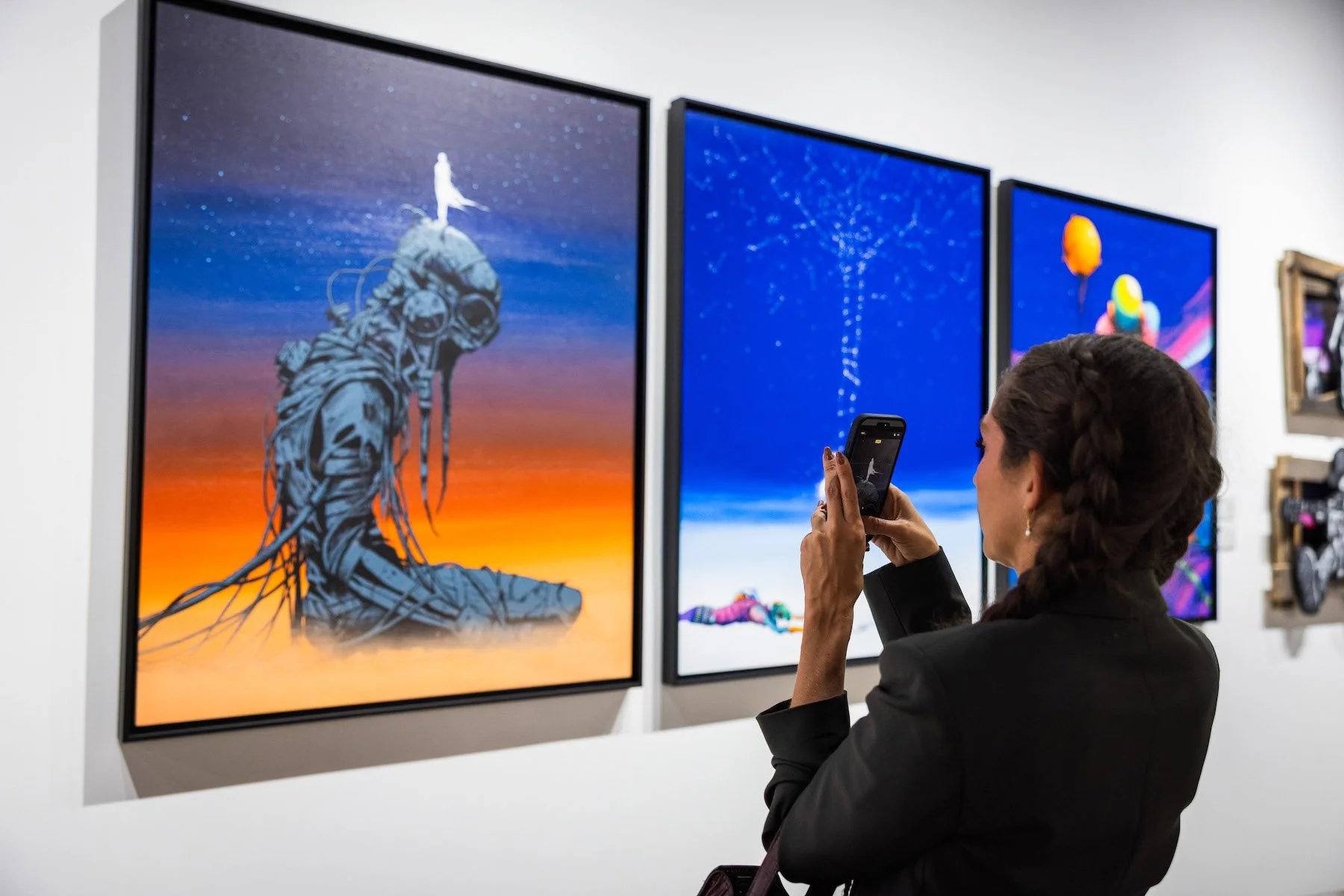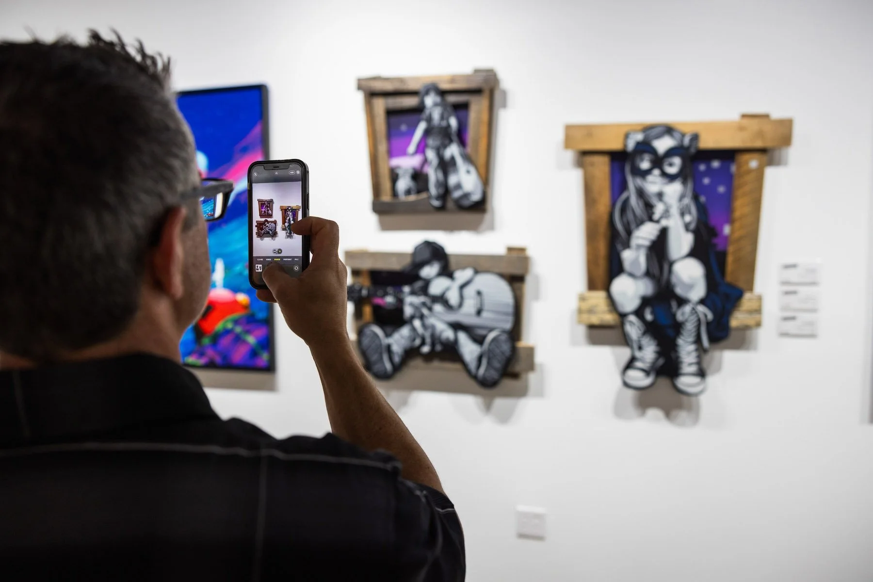 multiple “micro-scenes” happening at once (arrivals, gallery viewing, mural moments, cocktails, VIP pockets)